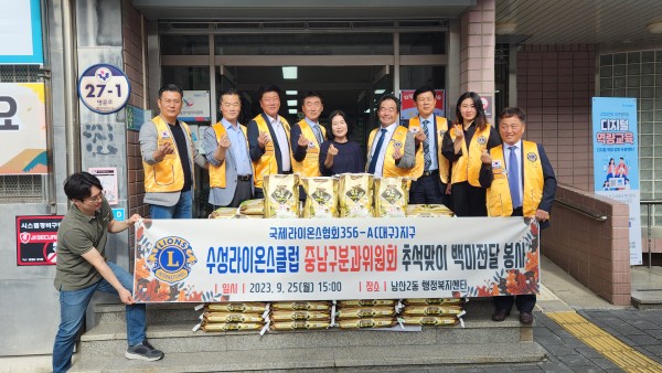 수성LC 추석맞이 백미전달봉사 356A지구 0 811 2023.10.04 13:29 대구수성라이온스클럽 중남구분과위원회 추석맞이 백미전달봉사 - 2023년 9월 25일, 남산2동 행정복지센터(회장 이대건L)