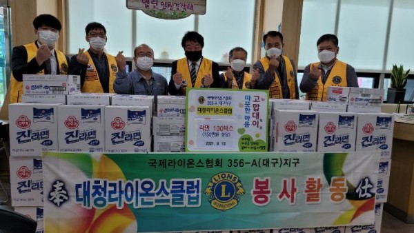 대청LC 추석맞이 봉사물품전달 356A지구 0 995 2021.09.30 13:20 대청클럽(회장 권기택L)에서는 추석맞이 봉사로자매단체인 남구 대명2동 행정복지센터에라면 100박스를 전달하였습니다.