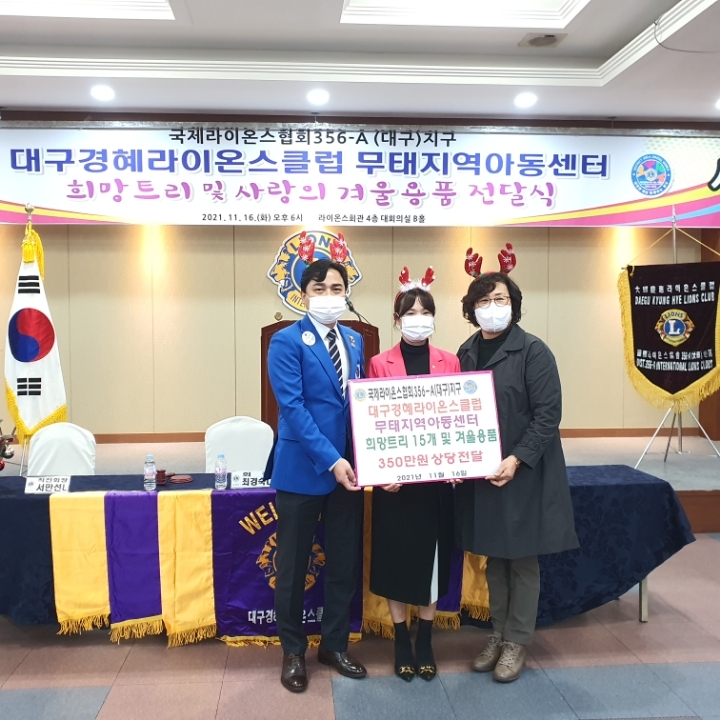 경혜LC 무태지역 아동센터 희망트리 및 겨울용품 전달식 356A지구 0 917 2021.12.01 13:30 https://cafe.daum.net/LionsDaeguClubs/RstK/1531 + 342 경혜클럽 무태지역 아동센터 희망트리 및 겨울용품 전달식(11월 16일)(회장 최경숙L)