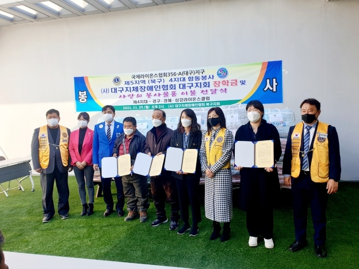 제5지역 4지대 합동봉사(대구시지체장애인협회 장학금 및 봉사물품 전달 356A지구 0 1084 2021.12.01 13:39 https://cafe.daum.net/LionsDaeguClubs/RstK/1535 + 375 5지역 4지대 합동봉사(4지대위원장 김경희L)경구클럽(회장 서신교L)경혜클럽(회장 최경숙L)삼강클럽(회장 이종복L)지체장애인협회 북구지회 이불 300만장학금 100만