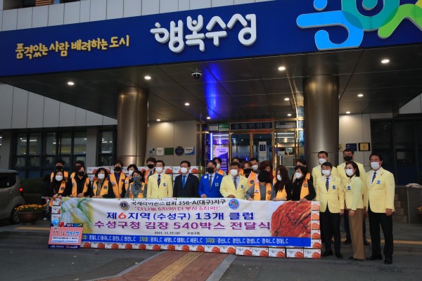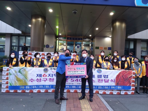 제6지역(지역부총재 최주영L) 수성구청 김장김치 전달봉사 356A지구 0 922 2021.12.01 14:01 https://cafe.daum.net/LionsDaeguClubs/RstG/547 + 358 6지역(수성구"부총재 최주영L)13개클럽 수성구청 김장 500만원 (540박스)전달봉사