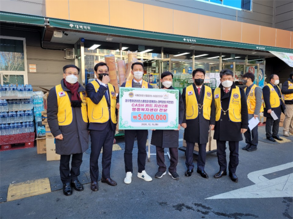 평화L.C 캐시카드봉사 356A지구 0 1222 2021.01.13 09:40 대구평화라이온스클럽(회장 백승배L)은 12월 15일 수성구 지산동에 거주하는 조손가정 및 형편이 어려운 가정 50곳을 선정해서 대백마트(목련점) 각 10만원 캐시카드를 충전해서 사용할 수 있는 봉사활동을 펼쳤다.