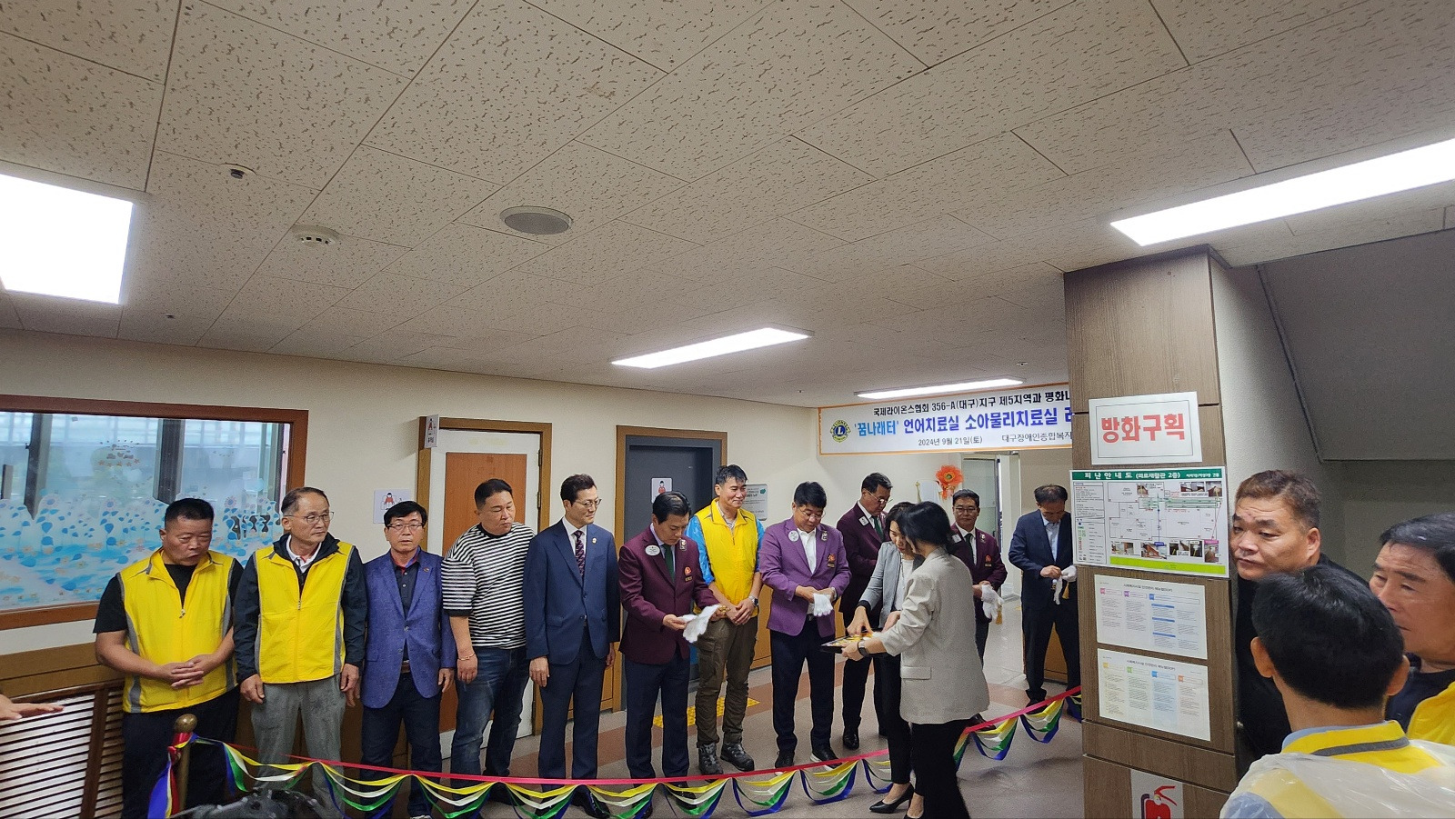 평화LC 대구장애인종합복지관 꿈나래터 개소식 356A지구 0 613 2024.11.06 11:44 대구평화라이온스클럽(회장 남수석L) 5지역과 합동봉사사업으로 2024.8.26(월) ~19일(25일간) 대구장애인종합복지관 꿈나래터(언어치료실,소아물리치료실) 리모델링 공사에 직접 참여하였으며본 클럽에서 봉사금 일천만을 지원 하였습니다.