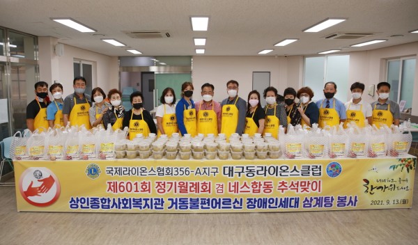 동LC 추석맞이 네스합동 삼계탕봉사 356A지구 0 1078 2021.09.30 12:11 https://cafe.daum.net/LionsDaeguClubs/RstH/554 + 409 2021.09.13대구상인종합사회복지관거동불편 장애인대상 삼계탕 조리 및 방문 전달