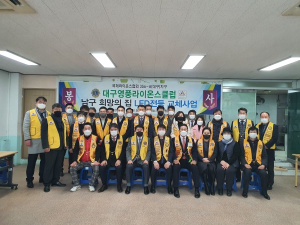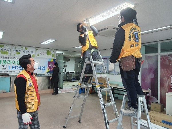 영풍LC 남구 희망의 집 LED전등 교체사업 356A지구 0 1277 2021.02.05 15:11 2021년 2월 5일(금)남구희망의 집대구영풍라이온스클럽(회장 권도현)은 지난 2월 5일 노후된 남구 희망의 집 급식소 1층, 2층 전등을 전면 LED전등(사업비 500만원)으로 교체하는 봉사사업을 펼쳤으며, 당일 회원들의 자발적인 재능기부로 마련되었다. 남구 희망의 집은 대구영풍라이온스클럽이 지난 20여년동안 매월 첫째주 금요일 약350명의 지역 결식 어르신들에게 건강한 생활을 위해 나눔급식봉사를 실천하고 있는 곳이다.