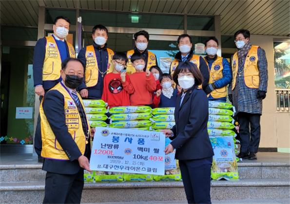 천우L.C 혜천원 난방유 및 백미전달 356A지구 0 1173 2021.01.13 09:50 대구천우라이온스클럽(회장 서동교L)은 지난 12월 15일 화요일 오후 4시 구세군 대구 혜천원을 방문하여 따뜻한 겨울나기 연말봉사 사업으로 난방유 1,200L와 백미 10kg 40포를 전달하였다