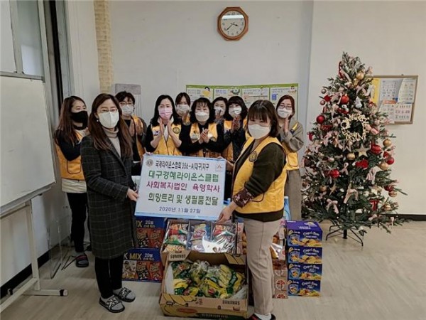 경혜L.C 희망트리 전달봉사 356A지구 0 1456 2021.01.13 09:44 대구경혜라이온스클럽(회장 서만선L)은 11월 27일(금)에는 아동보육시설 육영학사 12월 7일(월)에는 아동보육시설 희망의 집을 방문하여 아동들에게 모두가 따뜻하고 행복한 연말연시 되기를 희망하는 희망트리 생필품과 다과를 전달하여 따뜻한 봉사의 손길을 전하였다.