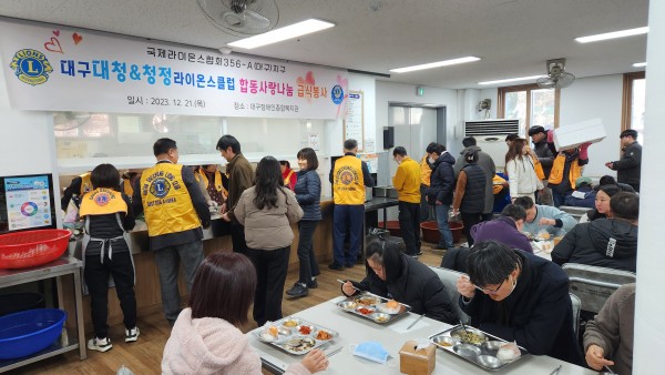 대청. 청정LC 합동 사랑나눔급식봉사 356A지구 0 785 2024.01.03 10:09 대구 대청 라이온스클럽 (회장 김을규L) & 대구 청정 라이온스클럽 (회장 여정현L)합동 사랑나눔 급식봉사 - 2023년 12월 21일, 대구장애인종합복지관