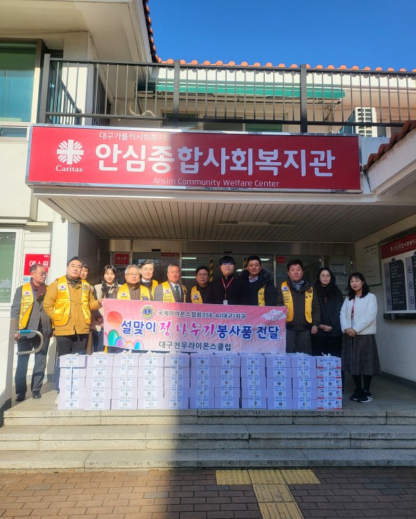 천우L.C 설맞이 정나누기 봉사물품 전달(안심종합복지관) 356A지구 0 634 2025.03.10 14:47 천우라이온스클럽 안심종합복지관 설맞이 정나누기 물품 전달봉사 (회장 석충원L)