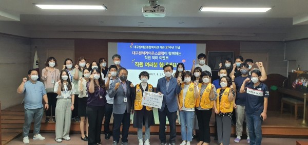 원혜LC 대구장애인종합복지관 직원격려 이벤트 356A지구 0 1127 2021.09.30 13:32 대구원혜라이온스클럽 대구장애인종합복지관 직원 격려이벤트 봉사활동 - 2021년 8월 27일 (회장 태경아L)직원 격려금 및 선물(삼계탕, 양말 세트 전달)