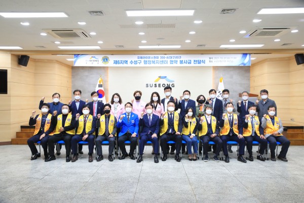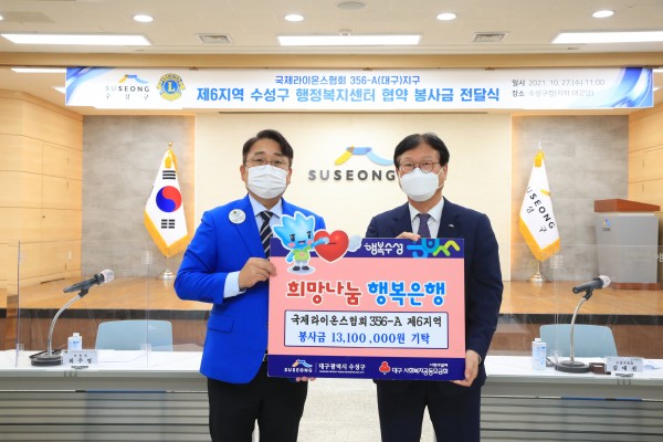 제6지역(지역부총재 최주영L) 수성구 행정복지센터 협약 봉사금 전달식 356A지구 0 1023 2021.12.01 13:42 https://cafe.daum.net/LionsDaeguClubs/RstG/543 + 343 2021년 10월 27일 대구시 수성구청
