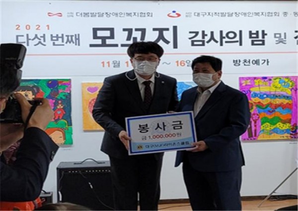 대구(MJF)LC 모꼬지 감사의 밤 및 전시회 356A지구 0 913 2021.12.08 14:09 대구(MJF)라이온스클럽(회장 김형규L)은 지난 11월 11일(목) 김광석거리 B커뮤니케이션에서 개최 된 모꼬지 감사의 밤 및 전시회에 참석하여 사회단체 더봄발달장애인복지협회에 봉사금 1,000,000원과 본 클럽 회원들의 개인봉사금 2,000,000원을 함께 전달하였다.