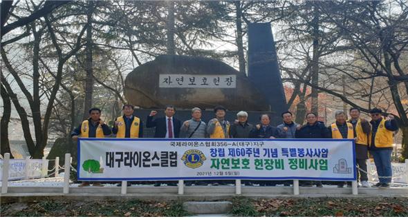 대구라이온스클럽(회장 김형규L)은 지난 12월 5일(일),창립 제60주년 기념 특별봉사사업으로 1978년도에 건립한 자연보호헌장비를 정비하였다.당일 앞산공원 내 자연보호 캠페인도 실시하였다.