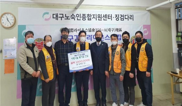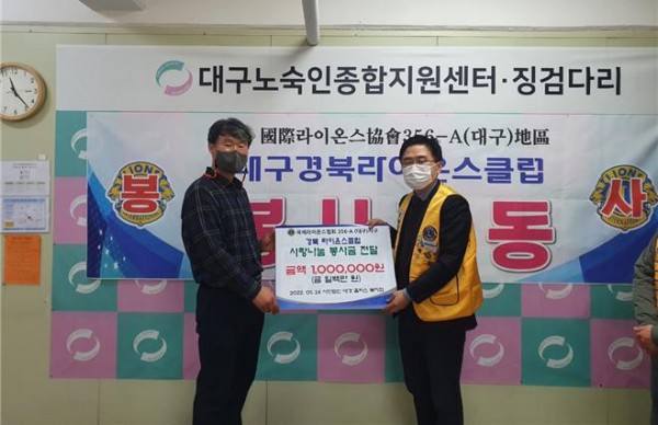 경북LC 대구노숙인종합지원센터. 징검다리 봉사금 전달 356A지구 0 921 2022.03.07 09:56 1. 대구경북라이온스클럽(회장 권중칠L)은 지난 1월 26일 설을 맞이하여 대구노숙인종합지원센터·징검다리에 어려운 소외계층들을 위하여 봉사금(약 100만원)을 전달하였다.