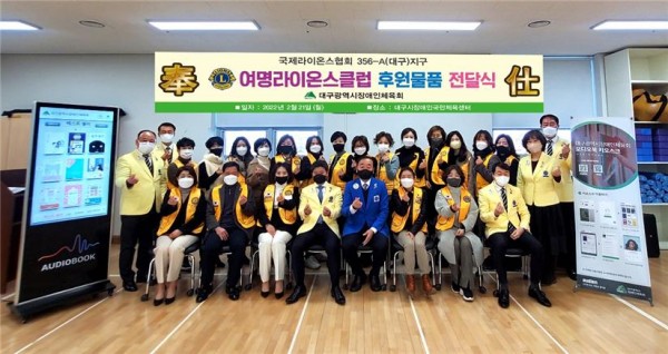 여명LC 대구시장애인체육회 오디오북 전달 356A지구 0 1057 2022.03.07 10:00 대구여명라이온스클럽(회장 신지영L)은 지난 2월 21일 대구시장애인체육회에 장애인국민체육센터 전자도서관 운영에 필요한 오디오북 300만원 상당을 전달하였다.