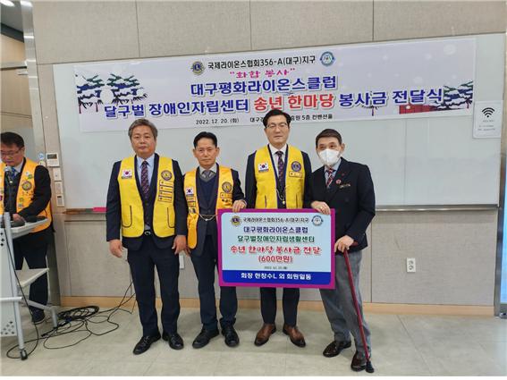 대구평화라이온스클럽(회장 한창수L)은 12월 20일 대구경북디자인진흥원 5층 컨벤션홀에서 장애인들의자립생활과 복지증진에 힘써 주시길 당부드리며 송년 한마당 봉사금을 전달하였다.