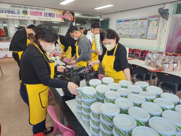 영룽LC+영림LC 합동 삼계탕 나눔봉사 356A지구 0 589 2023.12.04 12:59 일시 : 2023년 11월 3일(금) 오전 6시 ~장소 : 남구 희망의 집봉사사업 : 삼계탕 350마리를 어르신에게 전달.참석 : 영풍L.C 회장 강보철L, 영림L.C 회장 최문선L 외 회원다수