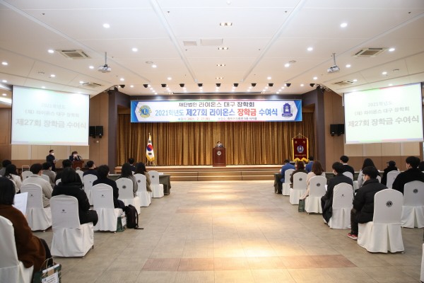 2021년 제27회 재단법인 라이온스 대구장학회 장학금 수여식 356A지구 0 1391 2021.03.04 14:01 2021년 2월 27일라이온스회관 5층 사자홀장학생 41명 각 200만원씩학습기자재비용 900만원 전달