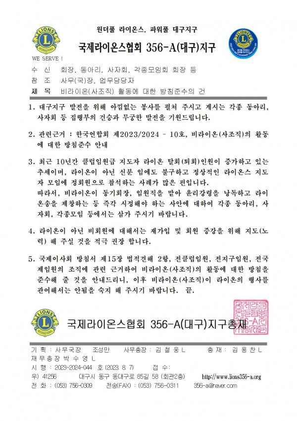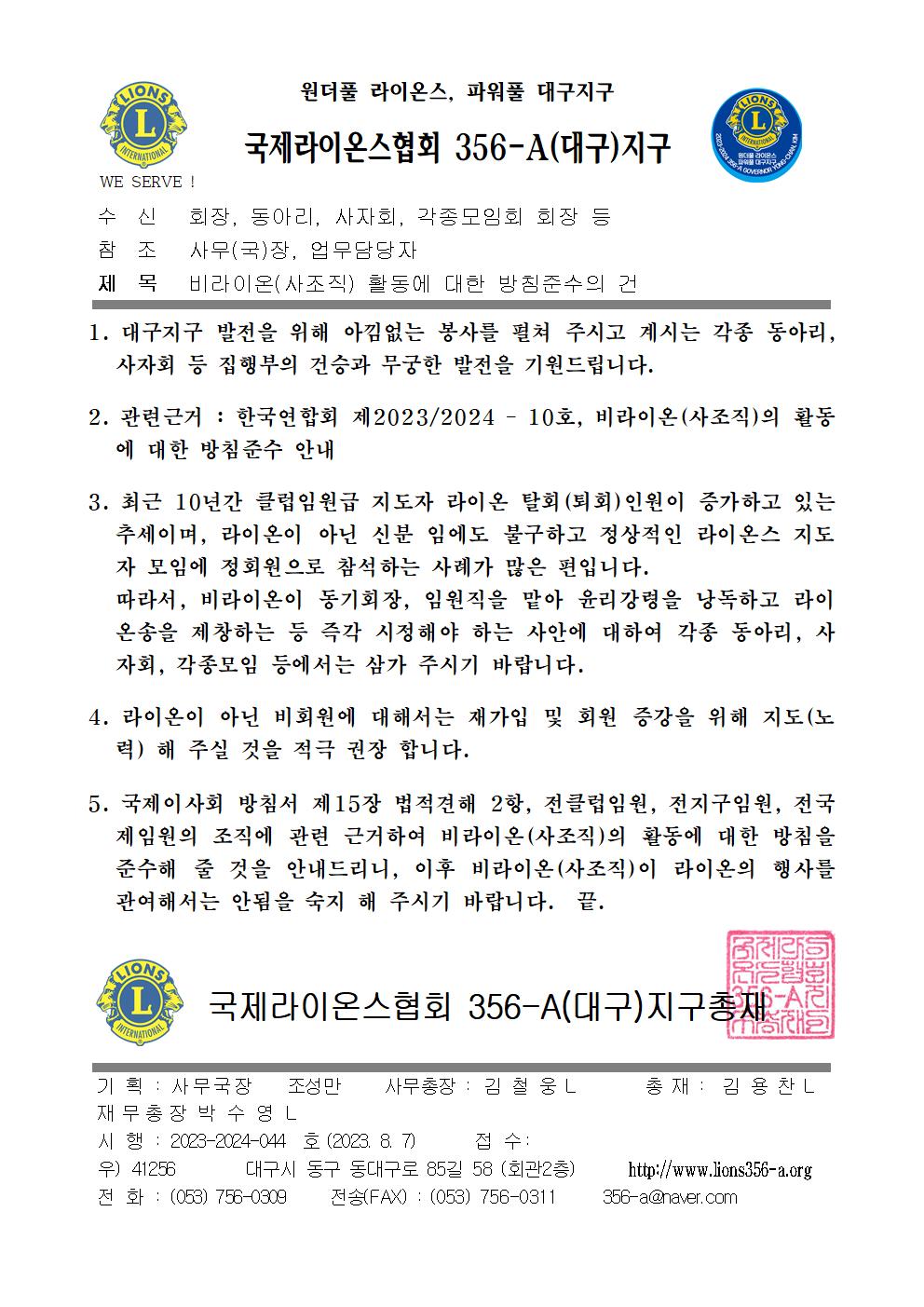 비라이온 사조직 활동 금지에 관한 건