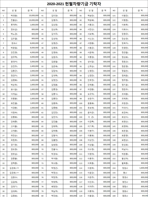 2020-2021 헌혈차량기금을 기탁자 리스트입니다. 356A지구 공문 및 안내 0 7956 2021.05.17 17:08 2021.05.20 09:16 헌혈차량기금기탁자.pdf (115.4K) + 17 2020-2021 "THE 나눔! PLUS"에동참해 주심에 감사드립니다.LCIF매칭사업으로 진행한 헌혈버스 기증 특별봉사에기탁해 주신 LION분들께 감사드립니다.