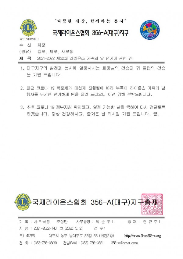 2021-2022 제32회 라이온스 가족의날 연기에 관한 건 356A지구 공문 및 안내 0 4294 2022.03.02 12:02 2021-2022 제32회 라이온스 가족의날 연기에 관한 건